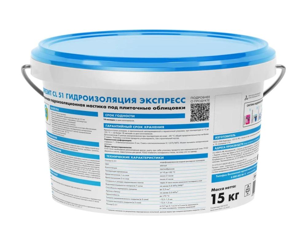 Гидроизоляция Ceresit CL 51 (15 кг) — эластичная водно‑дисперсионная мастика. Защищает от влаги, подходит для ванных и балконов. Простое нанесение, долговечность покрытия. Закажите онлайн — доставим по Сочи или ждём на складе!