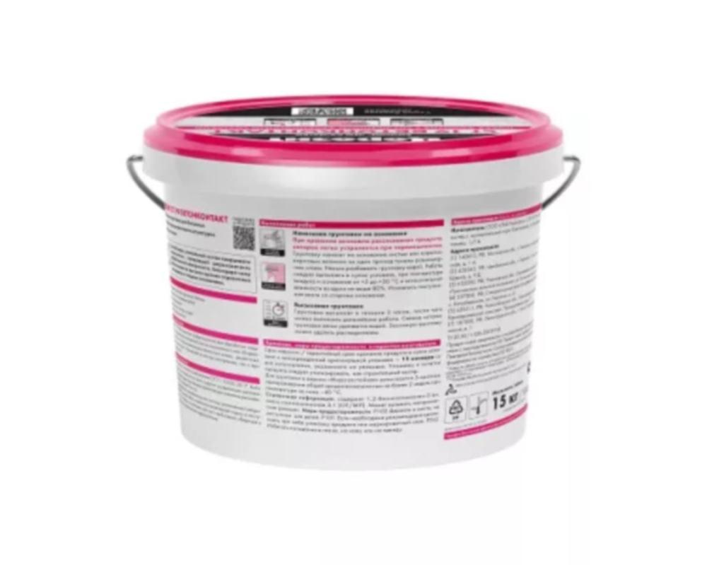 Объём — 15 кг; адгезионные свойства (улучшает сцепление материалов); подходит для бетона, кирпича, гипсокартона; водостойкий (не боится влажности).