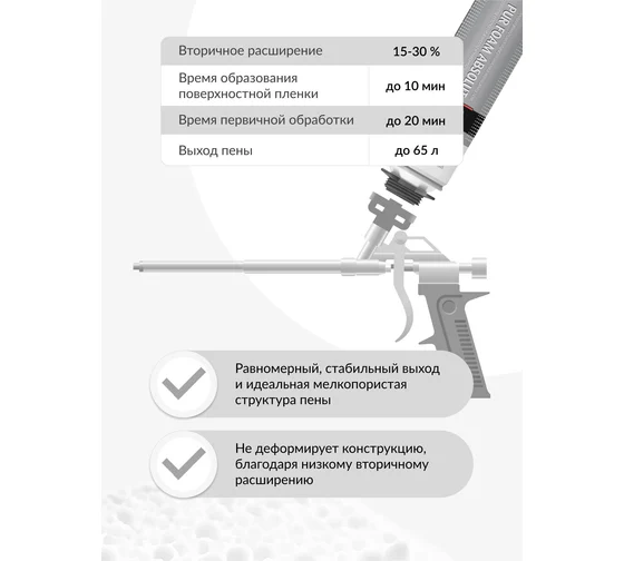 Ключевые преимущества: высокая адгезия к строительным материалам, равномерный выход, мелкопористая структура, отличная термо- и звукоизоляция, низкое вторичное расширение.