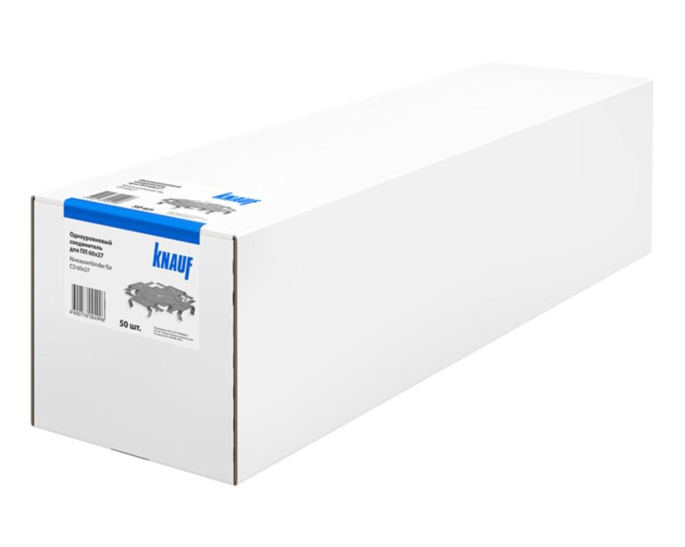 Размер — 60×27 мм; изготовлен из оцинкованной стали (устойчив к коррозии); совместим с профилями Knauf; обеспечивает жёсткое соединение элементов каркаса.