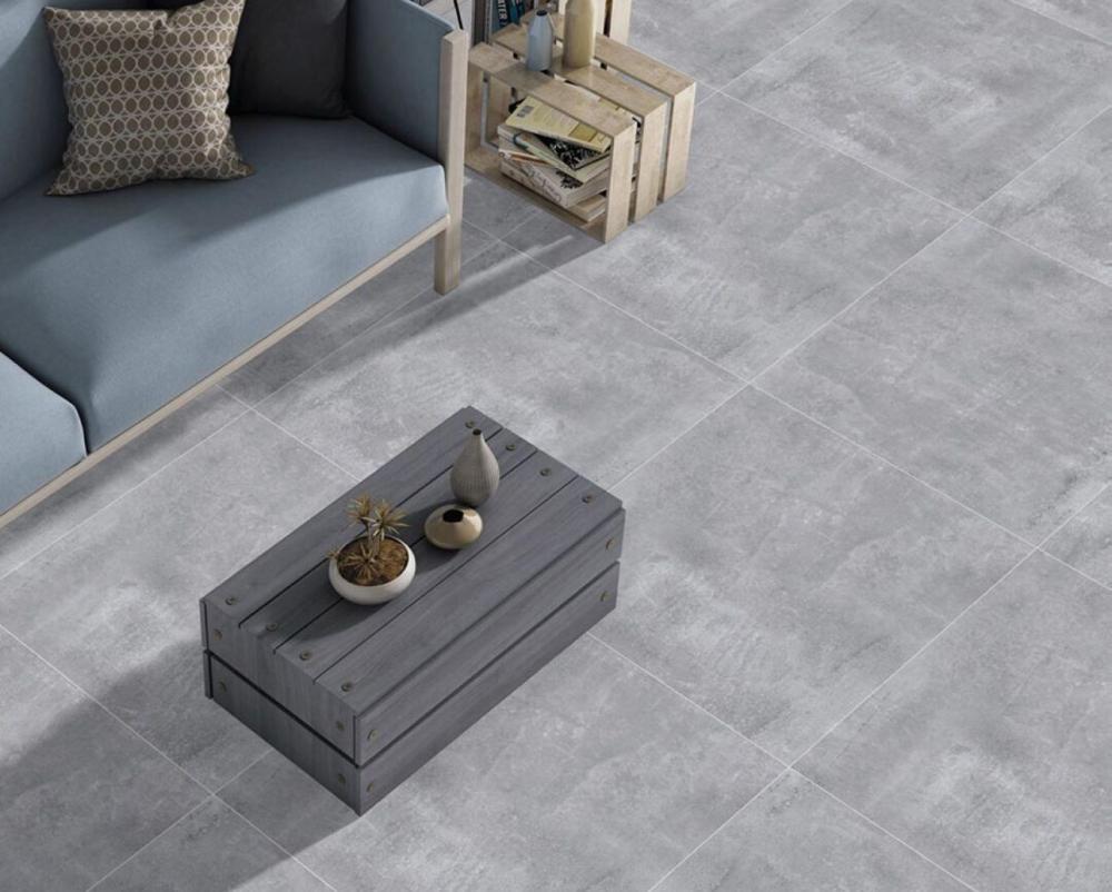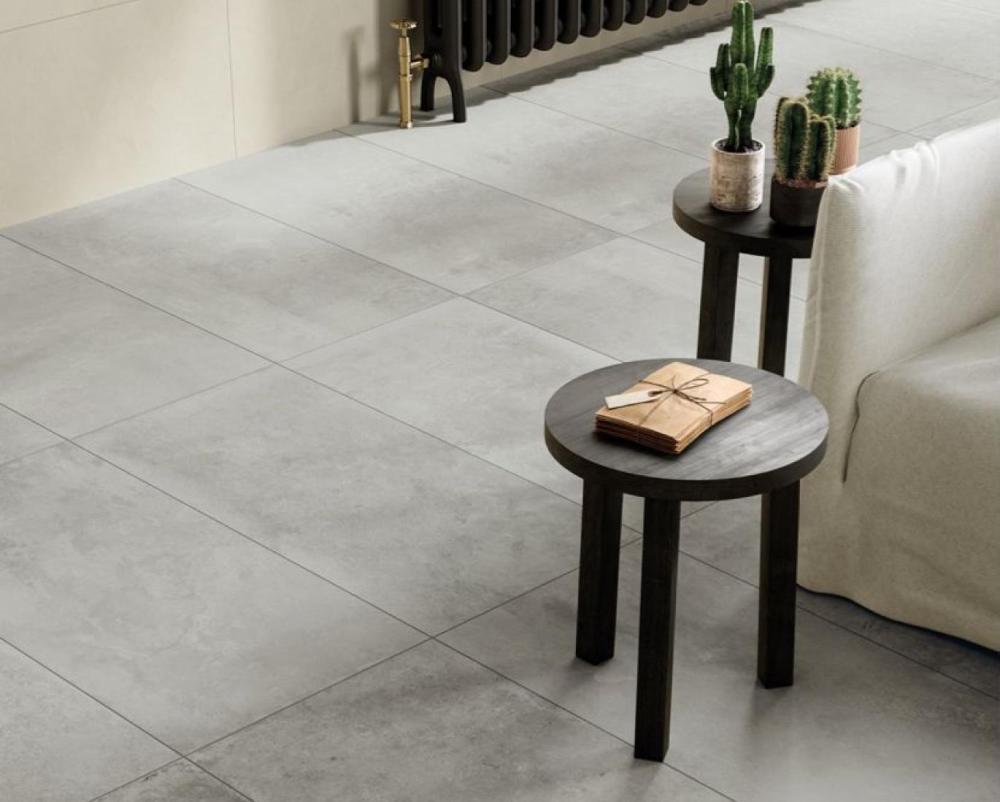 Размер плитки — 60×120 см (удобно для быстрой укладки); цвет — светло‑серый (универсально сочетается с разными стилями); материал — керамогранит (устойчив к износу); поверхность имитирует бетон (добавляет интерьеру характера).